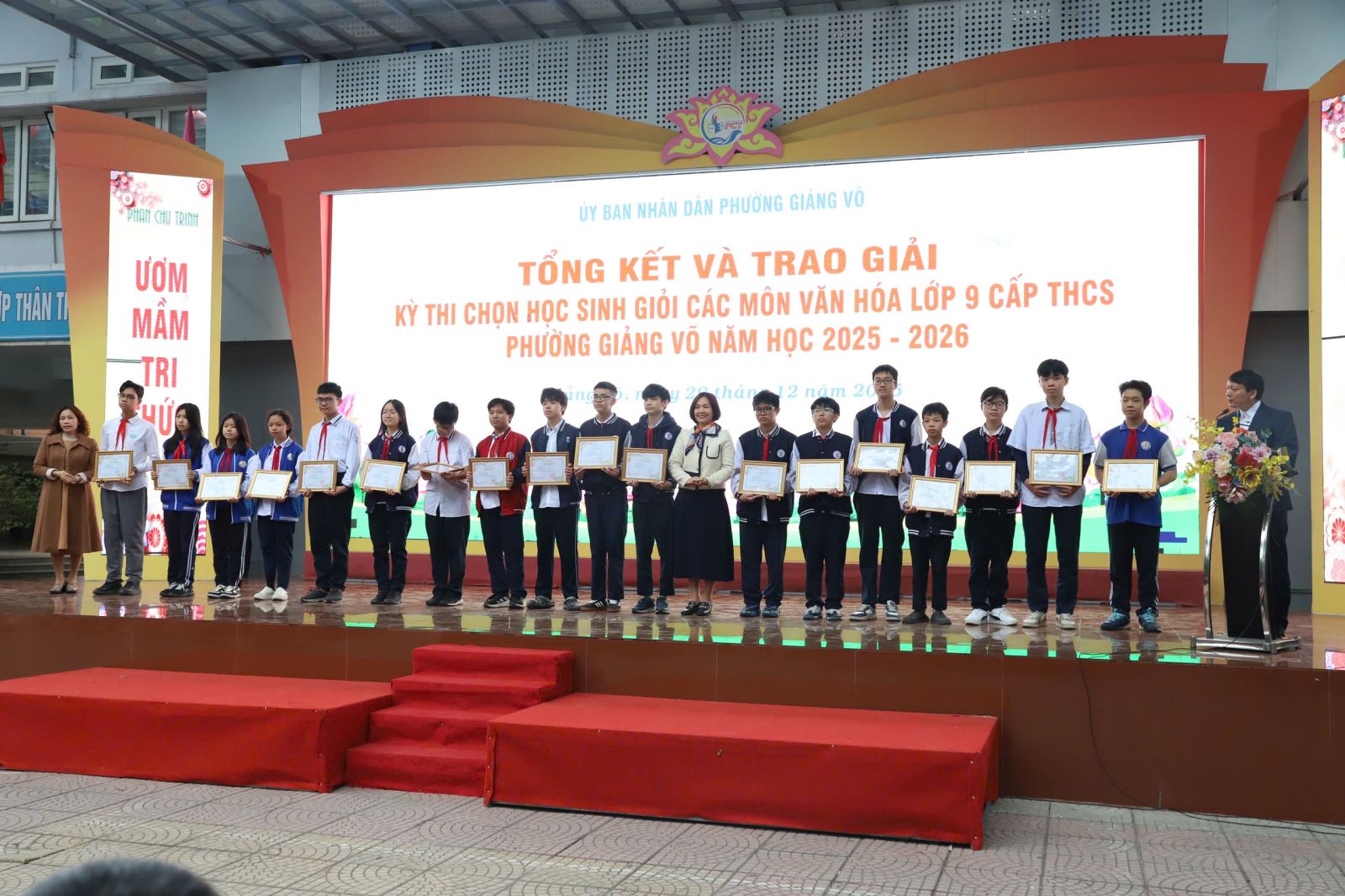 Sáng ngày 29 tháng 12 năm 2025, Ủy ban Nhân Dân phường Giảng Võ đã long trọng tổ chức lễ tổng kết và trao giải kỳ thi chọn học sinh giỏi các môn văn hóa lớp 9 năm học 2025-2026. Buổi lễ là dịp để ghi nhận những thành tích xuất sắc của các em học sinh, đồng thời tôn vinh các thầy cô giáo đã tích cực hướng dẫn, hỗ trợ các em trong quá trình ôn luyện.