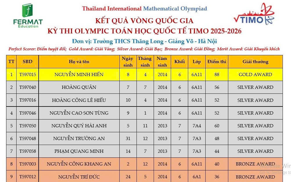 Trong không khí tự hào của mùa thi Olympic Toán Quốc Tế, trường THCS Thăng Long vui mừng thông báo về thành tích xuất sắc của các em học sinh trong kỳ thi Olympic Toán Quốc tế TIMO 2025-2026. Với lòng đam mê và nỗ lực không ngừng, các em đã mang về tổng cộng 29 giải thưởng danh giá, trong đó có 1 giải Vàng, 6 giải Bạc và 22 giải Đồng. Những thành tích này không những thể hiện tài năng Toán học của các em mà còn phản ánh công sức của các thầy cô trong tổ Tự nhiên đã tận tình hướng dẫn, dìu dắt các em vượt qua mọi thử thách.