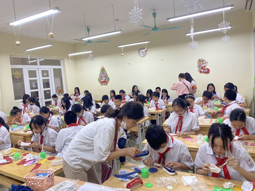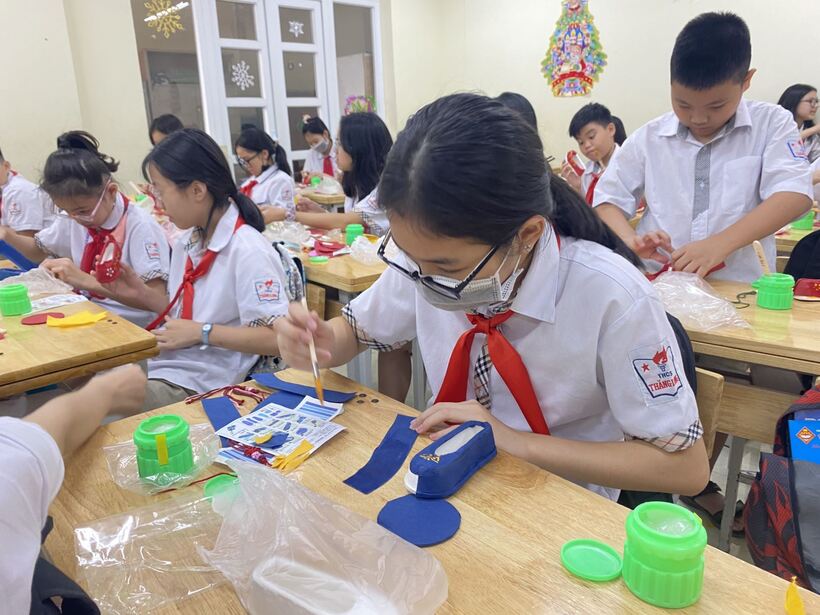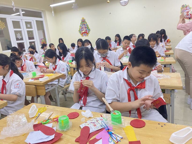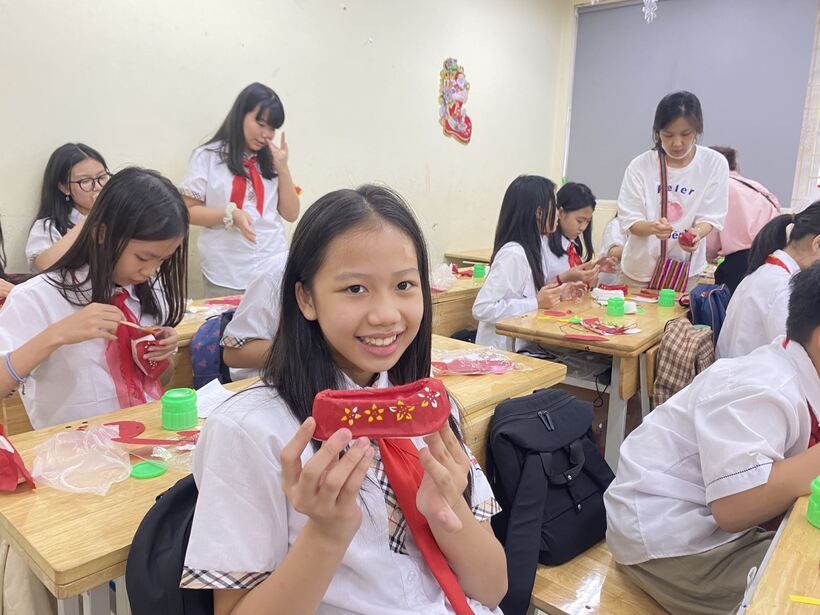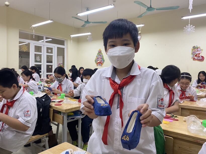 Cô Lim hướng dẫn các bạn làm từng bước một. Chúng em vừa nghe vừa bàn luận thật sôi nổi vì bạn nào cũng thấy thật lạ và khó làm. Ban đầu, em và các bạn đều hơi lúng túng khi trang trí cho đôi giày, vì chỉ không khéo léo một chút thôi nó cũng có thể bị hỏng ngay. Khi đã hiểu cách làm và thành thạo hơn, các bạn đều làm rất đẹp và bắt mắt. Các cô vừa đi vừa quan sát xem bạn nào làm chưa tốt thì sẽ giúp đỡ ngay. Phần nào khó, các bạn không làm được, cô đều đi đến tận nơi và làm giúp. Và khi tất cả đã hoàn thành, mặt bạn nào cũng cười thật tươi vì giờ đây trên tay ai cũng là một đôi giày thật xinh xắn và độc đáo. Cuối buổi học, chúng em được chụp ảnh kỉ niệm cùng các cô và sản phẩm của mình. Tiết học thật vui và bổ ích!