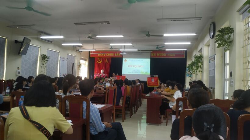 Mở đầu cuộc họp là các hoạt động của công đoàn nhà trường: triển khai các cuộc thi thể dục thể thao dành cho cán bộ giáo viên và trao quyết định nâng lương và phụ cấp thâm niên cho cán bộ giáo viên. Đây chính là hoạt động thường kì cho thấy việc thực hiện dân chủ trong trường học của nhà trường rất tốt để đảm bảo quyền lợi cho cán bộ giáo viên.
