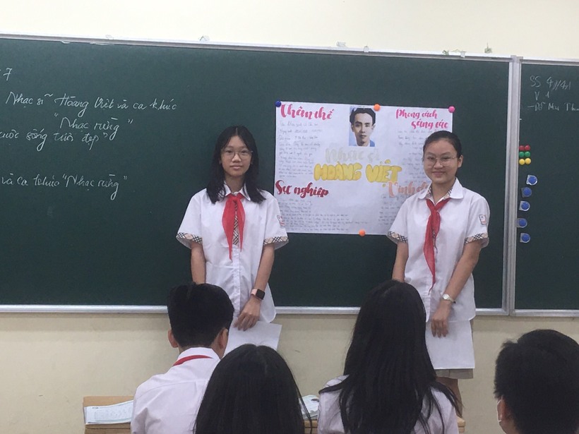 Tiếp đến là phần về tìm hiểu nhạc sĩ Hoàng Việt, đại diện lớp lên trình bày là bạn Minh Anh và Hiền Anh. Các bạn tìm hiểu kĩ càng, cùng với giọng thuyết trình tự tin, mạch lạc khiến chúng tôi như cuốn vào ngay. Sau khi chốt lại nội dung cô Hạnh đã cho chúng tôi chơi trò chơi đoán tên bài hát của nhạc sĩ Hoàng Việt, nghe đến bài nào cả lớp đều sôi nổi giơ tay, thậm chí còn tranh nhau trả lời. Mọi người vui vẻ tưởng chừng quên luôn đây là tiết dự giờ. Tiết học Âm nhạc hôm đó thành công tốt đẹp ngoài mong đợi. Chúng tôi vui lắm vì nhờ có những tiết học sôi nổi như vậy mà tinh thần đoàn kết, sự nhiệt tình của mỗi thành viên có cơ hội được phát huy, lớp càng thêm được sự tin tưởng của các thầy cô và chúng tôi càng thêm hứng khởi mỗi tiết học.