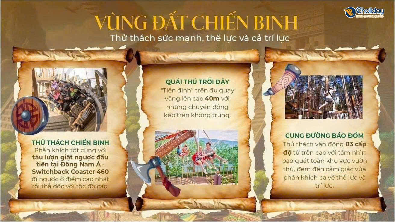 Tiếp theo , mọi người đến khám phá “ vùng đất chiến binh “ với những trò chơi ngoài trời như : quái thú trỗi dậy , vũ điệu trên không , cạm bẫy rừng xanh , thử thách chiến binh ,.... Đó là những trò chơi cảm giác mạnh không phải ai cũng dám thử , mang lại cho người chơi trải nghiệm hồi hộp , đầy phấn khích . Ngoài chúng tôi còn được đến với “ thế giới thần tiên “ cùng các trải nghiệm : lâu đài kỳ ảo , thị trấn cổ tích , ngôi nhà trên mây , nông trại hoàng gia ,.... những khu tham quan đầy thơ mộng và huyền bí . Cuối cùng , chúng tôi lưu lại kỉ niệm nơi đây bằng những bức ảnh photoboth tuy đơn giản nhưng lại chứa nhiều tình yêu cùng những niềm hạnh phúc .