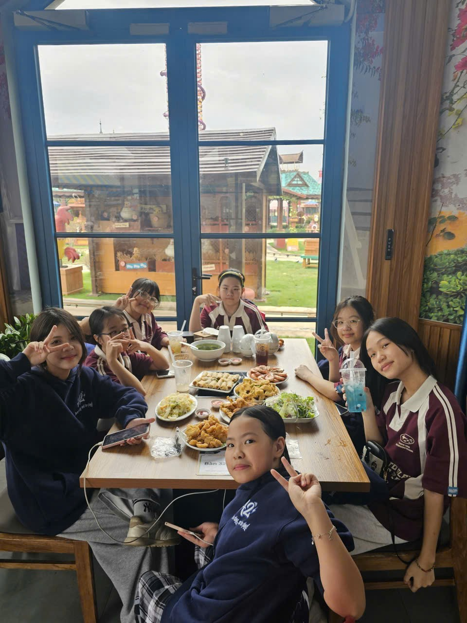 Khoảng một lúc sau, chiếc xe dừng lại trước cổng VinWonders. Nhìn từ xa, khu vui chơi hiện lên rộng lớn và đầy màu sắc. Những trò chơi cao vút cùng tiếng nhạc rộn ràng khiến em càng thêm háo hức. Cô giáo tập hợp cả lớp lại, nhắc chúng em đi theo nhóm và giữ gìn trật tự. Sau đó, chúng em bắt đầu tham quan và trải nghiệm các trò chơi.