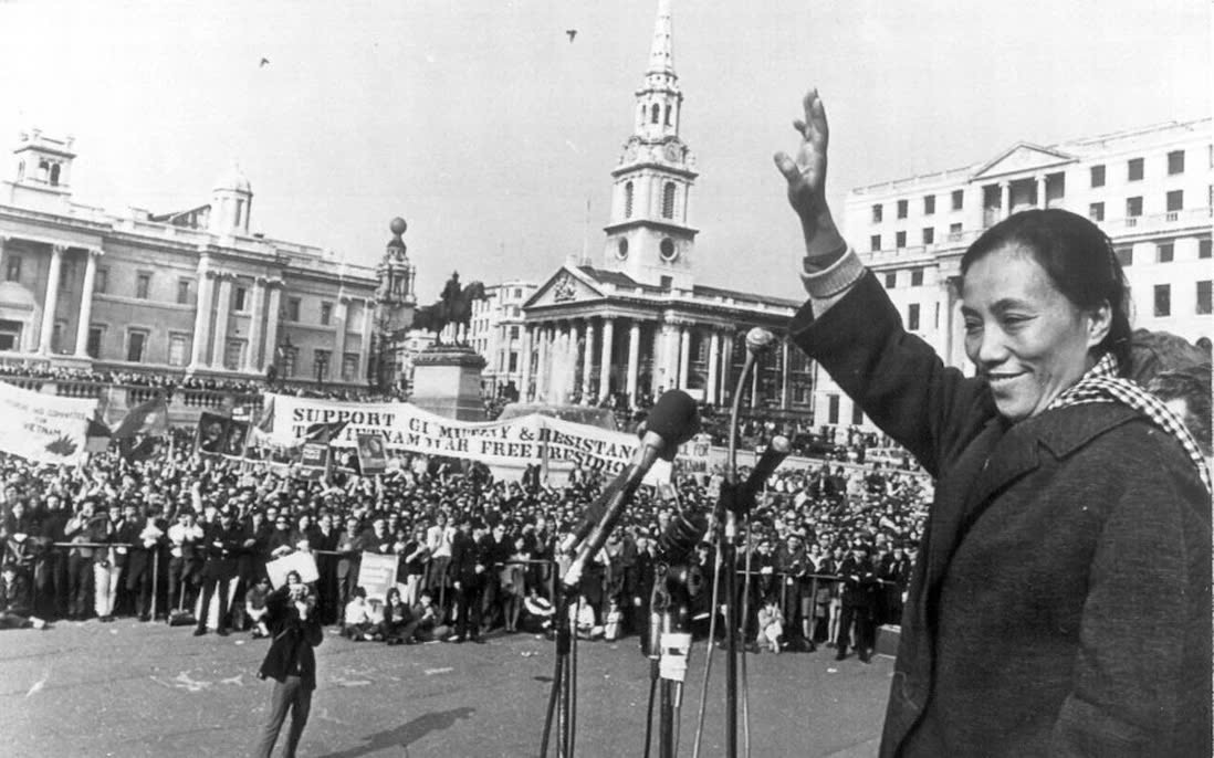 ( Bộ trưởng Ngoại Giao Chính phủ Cách mạng lâm thời Cộng Hòa miền Nam Nguyễn Thị Bình vẫy tay chào những người ủng hộ cách mạng Việt Nam tại Quảng trường Trafalgar của London ( Anh) ngày 7 tháng 4 năm 1969)