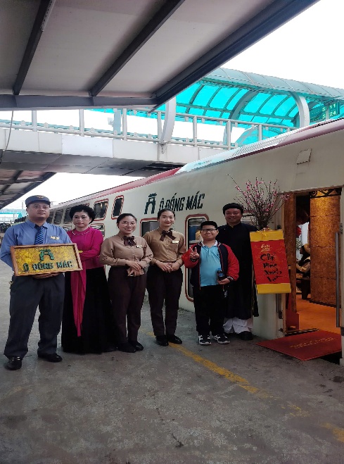 Khi tôi đến cửa toa để chuẩn bị lên tàu, các cô chú nhân viên mặc những bộ áo dài truyền thống và bộ áo tứ thân đã có màn chào đón mẹ và tôi rất lịch sự. Tôi thực sự có ấn tượng rất tốt với màn chào khách này.