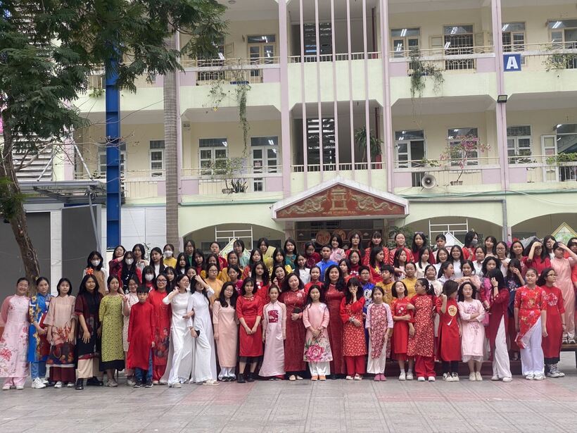 Sự kiện tiếp theo diễn ra từ thứ Hai đầu tuần đến thứ Bảy cuối tuần là phong trào mặc áo dài để hưởng ứng và cổ vũ Tuần lễ Áo dài Việt Nam. Không chỉ phát động tới các cô giáo, nhà trường còn phát động các con học sinh cùng mặc áo dài trong ngày 8/3. Với nhiều con, đây là lần đầu tiên, các con đến trường trong trang phục áo dài, vì thế các bạn ấy đã không giấu được những cảm giác vừa lạ lẫm, vừa thích thú với tà áo dài thướt tha. Trong trang phục lễ hội, trông bạn nào cũng lớn hơn, xinh xắn và đáng yêu hơn. Giờ ra chơi của buổi học, các con được xuống sân chụp ảnh cùng Ban giám hiệu và các thầy cô giáo. Đây cũng là dịp để nhà trường giáo dục và khơi dậy trong học sinh những nét đẹp và văn hóa truyền thống, giúp các con có ý thức trân trọng, bảo tồn, phát huy nét đẹp từ tà áo dài và những giá trị quý báu của dân tộc.