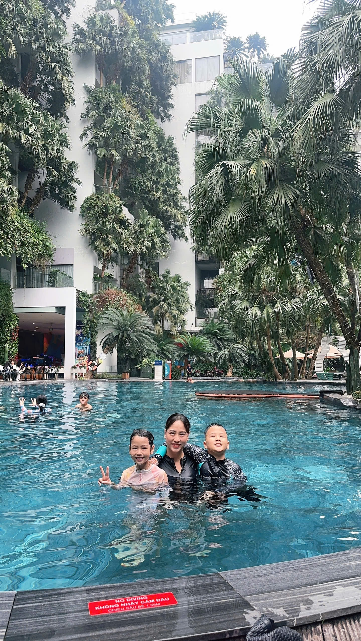 Sau khi nhận phòng, cả nhà tôi di chuyển ngay đến bể bơi vô cực để hòa mình vào làn nước trong xanh, mát mẻ. Vừa xuống nước, cảm giác sảng khoái đã làm tôi tan biến mọi mệt mỏi sau chuyến di chuyển dài. Tôi và em gái thi nhau bơi lội rồi cùng bà và bố mẹ ngắm nhìn cảnh rừng thông phía xa xa. Sau khi bơi thỏa thích cả nhà tôi cùng nhau lên bờ để thưởng thức những ly nước trái cây mát lạnh .