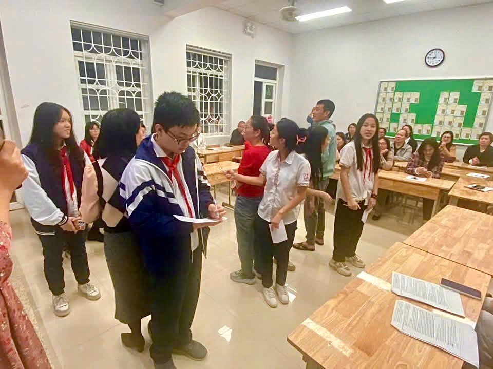 Đặc biệt, phần được mong chờ nhất trong buổi họp là trò chơi mang tên “Mảnh ghép thấu hiểu” – nơi phụ huynh và học sinh được cùng nhau tham gia. Ba cặp bố mẹ và con được mời lên sân khấu, ngồi quay lưng vào nhau và trả lời nhanh những câu hỏi quen thuộc nhưng không hề dễ. Khi những tờ giấy được giơ lên, có cặp trùng khớp khiến cả lớp vỗ tay reo vui, cũng có cặp khác bật cười vì nhận ra mình vẫn chưa thực sự hiểu con – hay con chưa đủ gần gũi với bố mẹ.