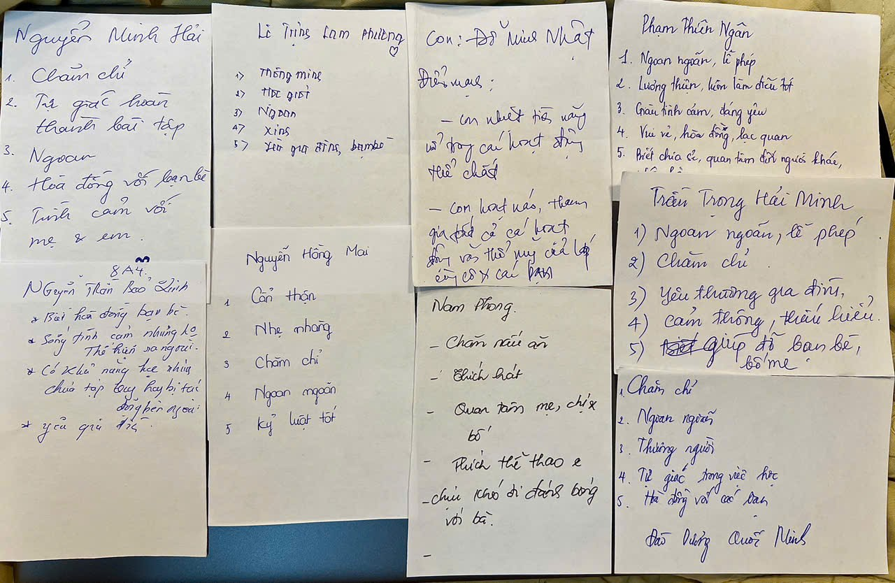 Không khí buổi họp trở nên gần gũi hơn khi phụ huynh và học sinh cùng tham gia các trò chơi tương tác. Trong hoạt động “Con cái chúng ta đều giỏi”, nhiều bố mẹ lần đầu tiên viết ra năm điểm tốt của con mình. Có lẽ, không ít phụ huynh đã bất ngờ khi nhận ra con mình có nhiều điều đáng tự hào đến vậy. Những tờ giấy nhỏ ấy chứa đựng rất nhiều yêu thương.