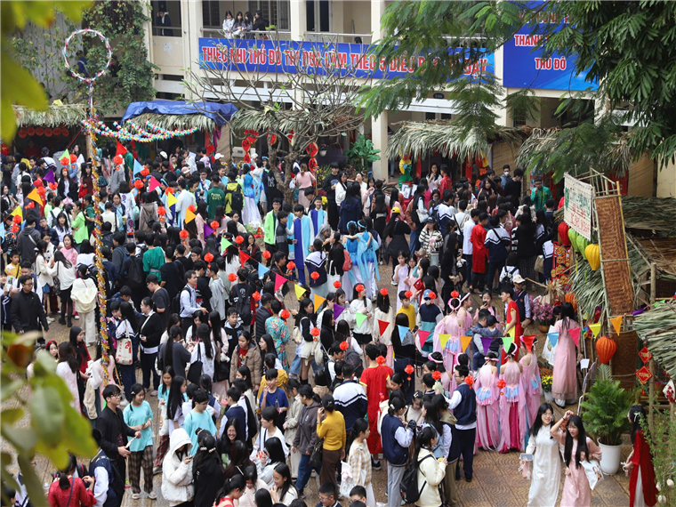 Cũng trong Lễ hội văn hóa dân gian của nhà trường, học sinh không chỉ được nhìn ngắm những không gian văn hóa làng nghề mà còn được tận mắt xem và trải nghiệm công việc làm nón, nặn tò hè, cắm hoa nghệ thuật, thưởng thức cốm làng Vòng, khoác lên mình tấm vải lụa mềm mại của làng Vạn Phúc…Các em cũng được xem nhiều tiết mục văn nghệ trình diễn đặc sắc mang đậm dấu ấn của từng làng nghề. Bên cạnh đó, các em cũng được đón nhận những nét chữ tài hoa may mắn, phúc lộc từ thầy đồ. Nhiều em cũng rất thích thú với các trò chơi dân gian. Và đặc biệt thích thú với phần giao lưu cùng các nghệ sĩ Nhà hát chèo Việt Nam để tìm hiểu về nghệ thuật hề chèo xuân, một nét văn hóa độc đáo và lâu đời của Việt Nam.