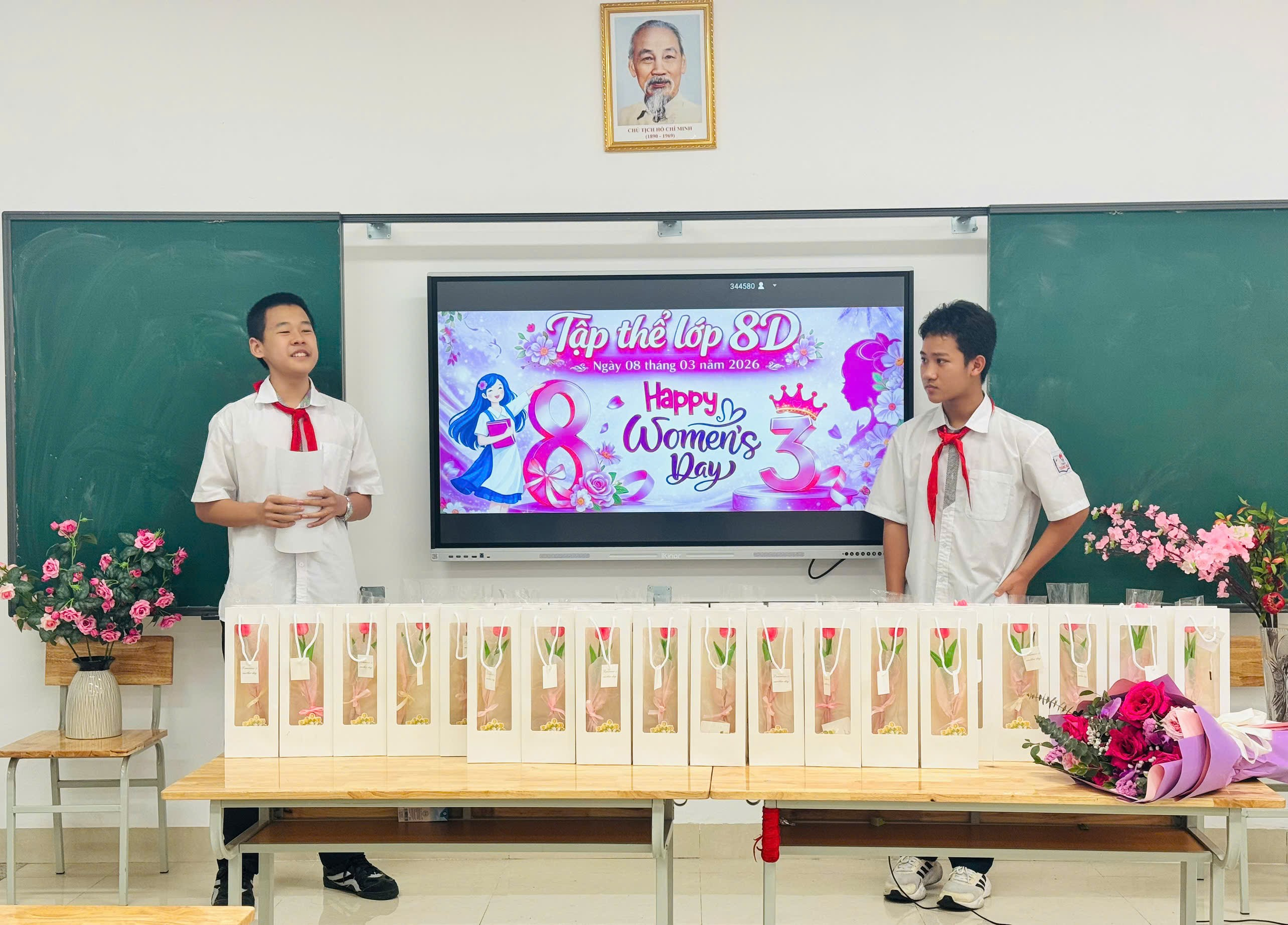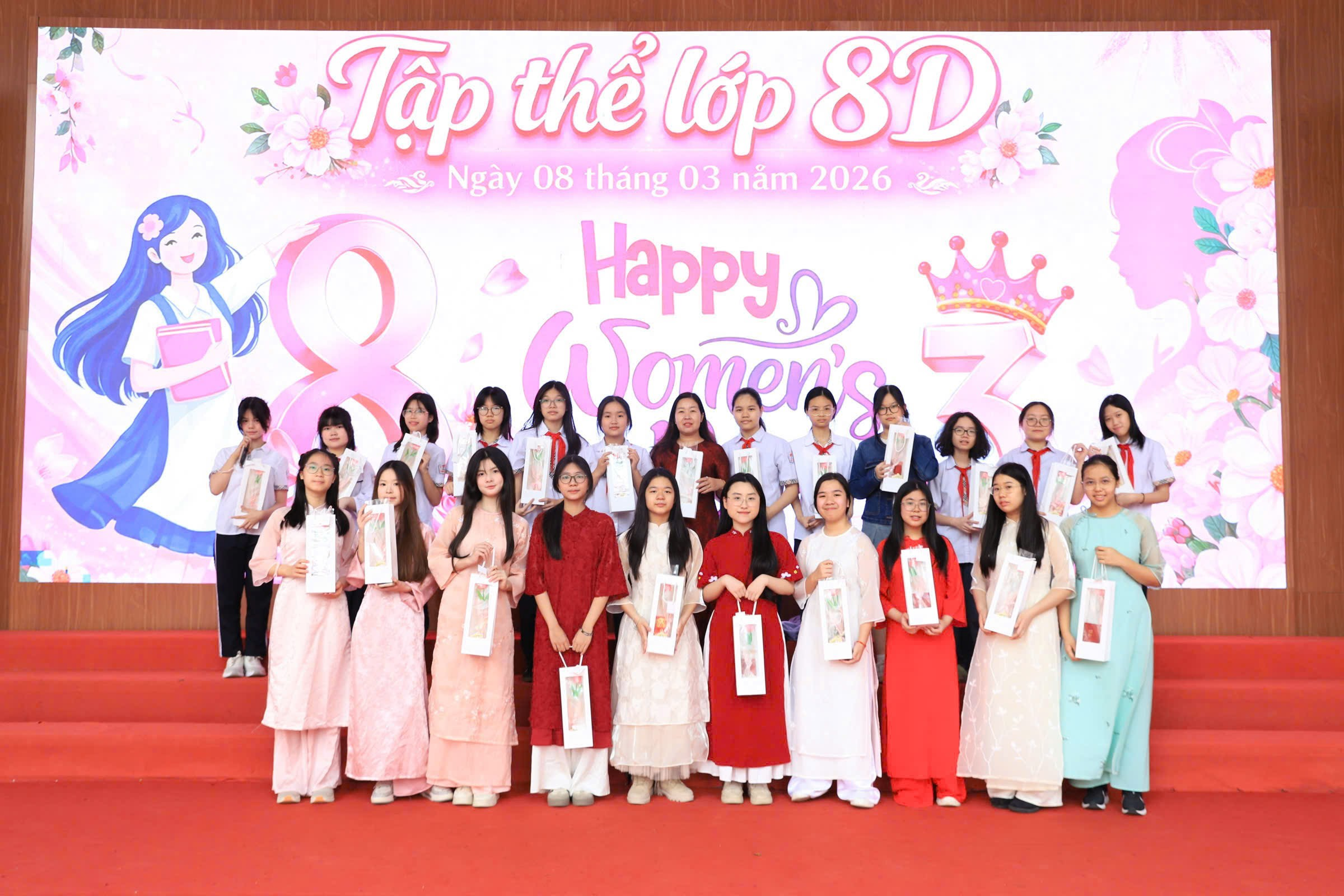 Trong buổi sinh hoạt, lớp 8D đã chuẩn bị những món quà nhỏ xinh kèm theo những bông hoa tươi thắm dành tặng các bạn nữ. Những món quà tuy giản dị nhưng chứa đựng tình cảm chân thành, thể hiện sự quan tâm và tinh thần đoàn kết của các thành viên trong lớp. Bên cạnh đó, chương trình còn có những tiết mục văn nghệ đặc sắc do chính các bạn học sinh biểu diễn. Đặc biệt, một bạn nam trong lớp đã mang đến tiết mục đàn và hát với cây đàn guitar, tạo nên bầu không khí vui tươi, gần gũi và tràn đầy cảm xúc. Tiếng đàn, lời ca cùng những tràng pháo tay cổ vũ của cả lớp đã làm cho buổi sinh hoạt trở nên sôi nổi và đáng nhớ hơn. Sau phần giao lưu văn nghệ, tập thể lớp đã cùng nhau chụp ảnh kỷ niệm trước phông nền. Các bạn nữ rạng rỡ trong những bộ trang phục xinh xắn, nhiều bạn diện tà áo dài truyền thống, tạo nên hình ảnh thật duyên dáng và tươi đẹp của tuổi học trò.
