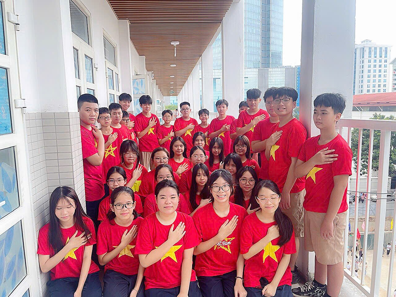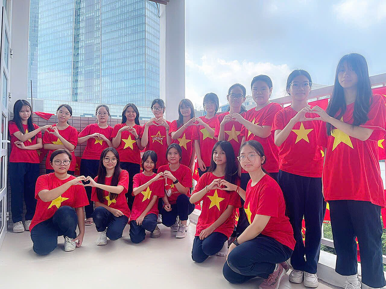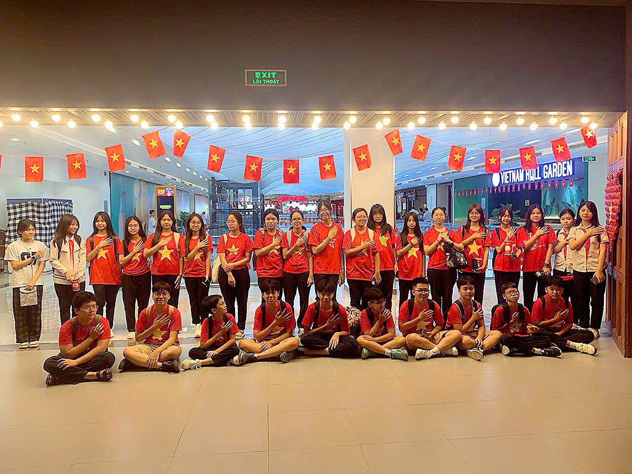 Ngày khai giảng năm học mới năm nay thật khác biệt đối với tập thể lớp 8E chúng tôi. Sau khi kết thúc buổi lễ trang nghiêm dưới lá cờ đỏ sao vàng tung bay trong nắng sớm, cả lớp không vội vã ra về như mọi năm mà cùng nhau đi bộ đến rạp chiếu phim để xem Mưa đỏ. Con đường từ trường đến rạp vốn quen thuộc, nhưng hôm ấy lại trở nên thiêng liêng lạ thường! Hàng dài áo cờ đỏ sao vàng đồng loạt rực sáng trên phố, như một dòng chảy tuổi trẻ tràn đầy niềm tự hào. Chúng tôi vừa đi vừa trò chuyện ríu rít, tiếng cười hồn nhiên hòa cùng những bước chân rộn rã, nhưng trong lòng ai cũng hồi hộp chờ đợi một điều gì đó thật đặc biệt đang đợi phía trước.