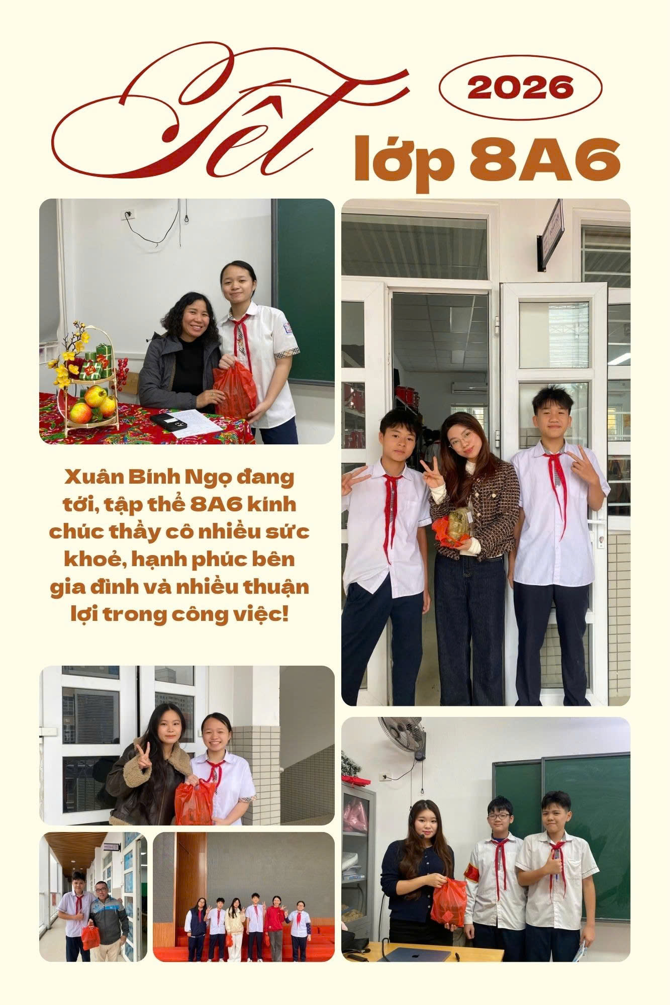 Nhân dịp năm mới, tập thể lớp 8A6 xin kính chúc các thầy cô bộ môn của lớp cũng như toàn thể thầy cô giáo trong hội đồng nhà trường luôn mạnh khỏe, hạnh phúc, tràn đầy nhiệt huyết và tiếp tục vững bước trên con đường “trồng người” cao quý, để mãi là điểm tựa vững chắc cho bao thế hệ học trò chúng em.