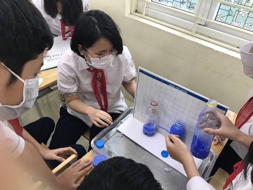 Trong tiết học, cô Thu Hoài đã dẫn dắt các con khám phá vấn đề một cách khéo léo, sáng tạo và logic. Bằng những dụng cụ rất đơn giản như chai, lọ, nước màu, các con học sinh được tự tay tiến hành các thí nghiệm theo các nhóm, quan sát và từ đó đưa ra các nhận xét đối với các vấn đề mà cô đưa ra. Có thể thấy các con học sinh rất tích cực và chủ động trong việc lĩnh hội kiến thức.