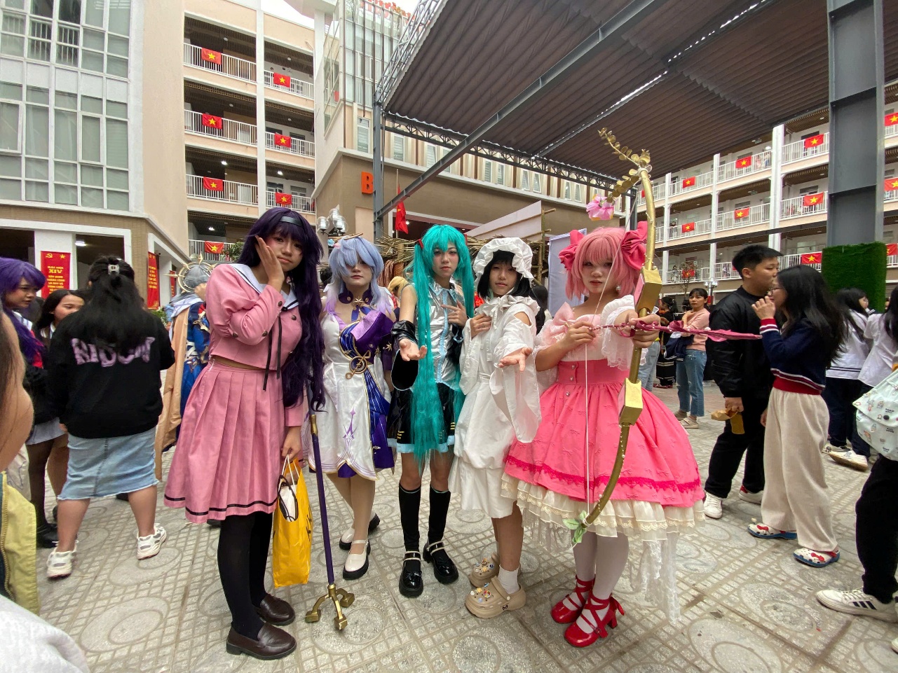 Giữa không gian đậm chất văn hoá dân gian ấy, điều khiến em ấn tượng và trầm trồ nhất chính là những màn cosplay đầy sáng tạo của các bạn lớp 8B, không chỉ mang đến lễ hội niềm vui, mà còn thổi vào sân trường một sắc màu rất mới, rất trẻ trung. Em không khỏi ngạc nhiên khi thấy một bạn cosplay nhân vật Miku với mái tóc dài xanh ngọc được buộc cao thành hai bím, mềm mại đung đưa theo từng bước đi. Bộ trang phục nổi bật khiến bạn như bước ra từ thế giới truyện tranh, mang theo nguồn năng lượng tươi sáng khiến ai đi ngang cũng phải ngoái nhìn. Bên cạnh đó, một bạn khác hóa thân thành Gawr Gura với mái tóc bạch kim ánh xanh, đôi mắt to tròn và chiếc hoodie cá mập quen thuộc. Hình ảnh ấy vừa đáng yêu, vừa độc đáo, khiến nhiều bạn học sinh không giấu được sự thích thú và ngưỡng mộ. Đặc biệt nhất là nhóm bạn với những phong cách khác biệt. Bạn đóng vai nhân vật Kaname Madoka thì diện bộ váy màu hồng phấn, toát lên vẻ trong sáng, dịu dàng nhưng đầy sức mạnh tiềm ẩn. Trong khi bạn khác mang phong cách gothic/fantasy tạo cảm giác huyền bí, nhẹ nhàng, như bước ra từ thế giới cổ tích hoặc anime fantasy. Còn một bạn đóng vai Akemi Homura với mái tóc đen tím, dài, thả tự nhiên, trang phục tông tím – đen, kín đáo, mang thần thái trầm, hơi lạnh, ánh mắt sâu – rất đúng với hình ảnh một nhân vật bí ẩn, mạnh mẽ và nội tâm.