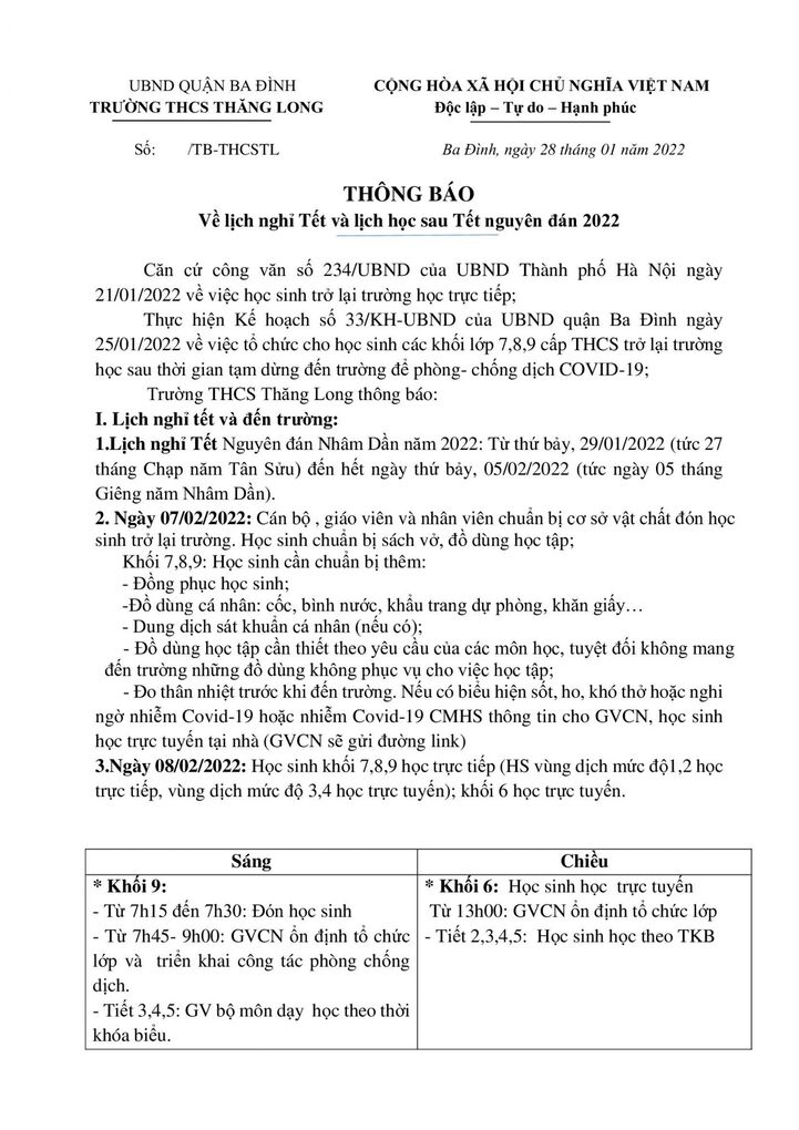 Thông báo về lịch nghỉ Tết và lịch học sau Tết nguyên đán 2022: