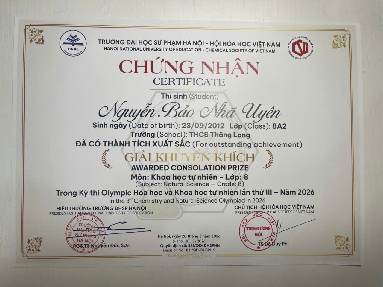 Trường THCS Thăng Long, phường Giảng Võ tự hào vinh danh 8 học sinh xuất sắc đạt một huy chương vàng, hai huy chương bạc, hai huy chương đồng và ba giải khuyến khích tại kỳ thi Olympic Hóa học và Khoa học Tự nhiên lần thứ ba, năm học 2026.