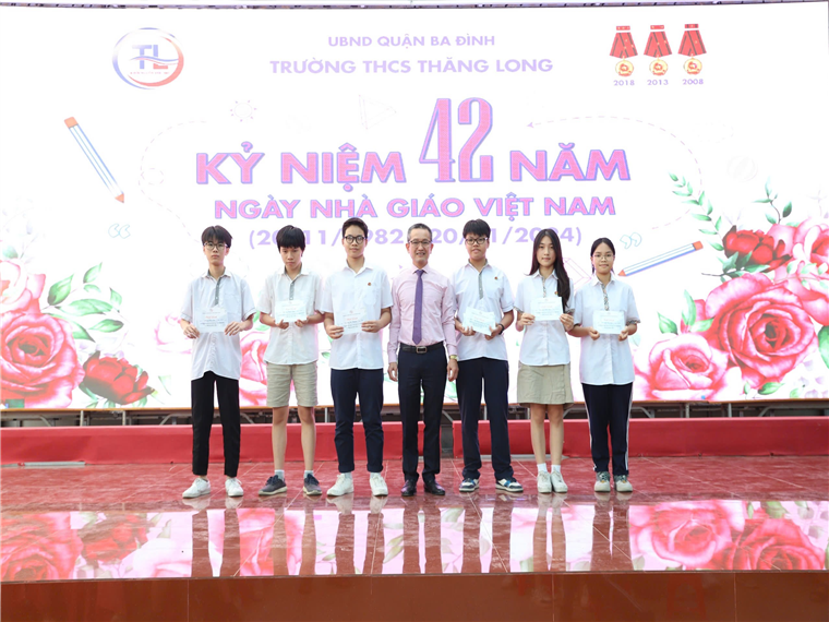 Sau những tiết mục văn nghệ sôi nổi, cô giáo Đặng Thị Ngọc Hà - Phó Hiệu trưởng nhà trường đã công bố các quyết định khen thưởng, tuyên dương các giáo viên và học sinh có những thành tích nổi bật với các nội dung thi đua. Một niềm vui nữa đến trong tháng 11 tri ân, đó là trao tặng phần thưởng cho các lớp đã đạt thành tích cao trong đợt thi đua chào mừng 20/11 như “Hoa học tốt”, thi vẽ tranh “Thầy cô và mái trường” của khối 6,7; thi làm clip “Thầy cô trong mắt em” của khối 8,9 ... Nối tiếp phần trao thưởng của cá nhân và tập thể, cô Ngọc Hà cũng công bố giải và trao tặng phần thưởng cho cuộc thi vẽ tranh với chủ đề “Hà Nội – Ba Đình trong trái tim em”. Học sinh trường THCS Thăng Long đã xuất sắc đạt được 03 giải Nhất, 01 giải Nhì, 01 giải Ba và là 1 trong 5 trường đạt giải tập thể có nhiều tranh đạt giải và có số lượng học sinh tham gia lớn. Để có được thành tích này không thể không nói đến sự hướng dẫn tận tình của cô giáo Nguyễn Thị Thắm – GV Mỹ thuật từ những ngày đầu phát động trong các tiết Mỹ thuật, động viên học sinh trong quá trình sáng tác cho đến những ngày cuối cùng, hỗ trợ các con hoàn thiện chỉnh chu tác phẩm.