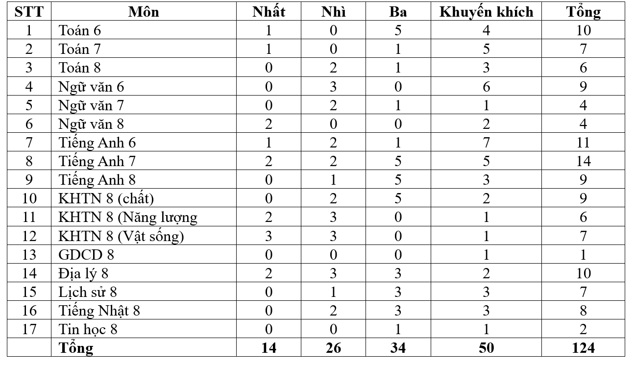 Điểm đáng chú ý ở kết quả lần này là các môn Tiếng Anh và các môn KHTN tiếp tục là thế mạnh của nhà trường. Cùng với đó nhiều học sinh đạt giải cao ở các môn mới như KHTN 8 (Năng lượng), KHTN 8 (Vật sống), khẳng định sự phát triển toàn diện về năng lực học tập cũng như sự đa dạng về giải thưởng ở nhiều bộ môn cho thấy sự đầu tư đồng đều, không chỉ tập trung vào các môn truyền thống.