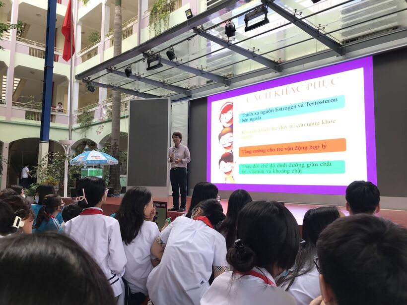 Với vai trò là diễn giả, cô Nguyễn Thanh Hiếu – Phó giám đốc Trung tâm y tế quận Ba Đình đã trao đổi về vấn đề dậy thì sớm ở lứa tuổi vị thành niên và chia sẻ với các em học sinh biết được thế nào là dậy thì sớm, những nguyên nhân, hậu quả và những giải pháp điều trị dậy thì sớm.