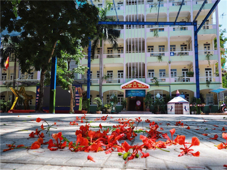 Ghế đá, hàng cây và sân trường đầy nắng