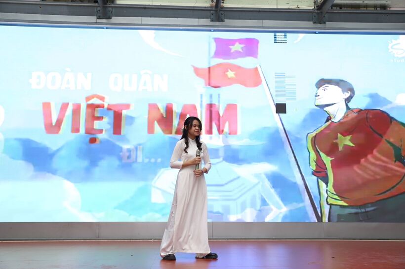 Từ 7h sáng, sân trường chìm trong áo trắng học trò và được trang trí cờ hoa rực rỡ lại thêm tiếng nhạc, tiếng học sinh rôm rả chuẩn bị chào đón chương trình. Khi cả trường đã ổn định, tất cả các thầy cô giáo và học sinh ánh mắt nhìn theo lá quốc kì đồng thanh hát vang bài “Quốc ca”.