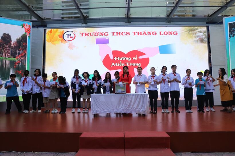 BGH nhà trường, các thầy cô giáo, các bạn học sinh cùng tham gia ủng hộ đồng bào Miền Trung