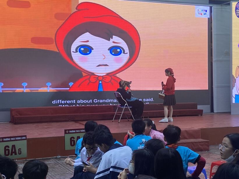 Đến với ngày hội ngôn ngữ hôm nay, em đã được xem nhiều tiết mục thú vị như lồng tiếng phim, các bạn đã cố gắng nhập vai vào các nhân vật trong phim và cố gắng thể hiện được cảm xúc, suy nghĩ của các nhân vật một cách trọn vẹn nhất. Để hiểu hơn về truyền thống văn hóa của đất nước khác, các đội Nhật, Hàn đã luyện tập công phu để mang tới cho người xem những tiết mục vô cùng đặc sắc như điệu múa truyền thống của Hàn Quốc từ lớp 6D. Tiếp đến là những phần thi thuyết trình vô cùng xuất sắc, giúp em mở mang tầm hiểu biết của mình không chỉ về ngoại ngữ mà còn các vấn đề khác trong xã hội. Trong đó, em ấn tượng nhất là phần thuyết trình “Hướng dẫn làm kimbap” do lớp 6A2 trình bày. Các em rất sáng tạo khi đã làm kimbap trực tiếp trên sân khấu giúp cho mọi người có thêm hình dung rõ nét và giúp tiết mục thêm phần thú vị. Còn đối với lớp em, các bạn đã chuẩn bị rất kì công cho tiết mục diễn kịch “ Little red riding hood- Cô bé quàng khăn đỏ”. Qua vở kịch này, chúng em muốn mang tới bài học cho các bạn học sinh về việc nói chuyện với người lạ sẽ gây ra những hậu quả khôn lường, đồng thời muốn phê phán những người xấu rồi sẽ nhận lại những điều thích đáng.