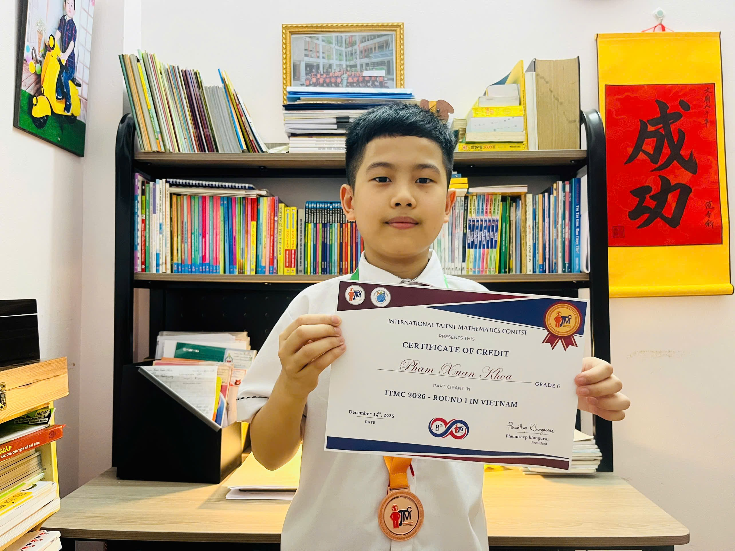 Niềm vui vỡ òa khi Khoa đạt Huy chương Đồng kỳ thi Toán quốc tế ITMC và Huy chương Đồng Đấu trường Toán học cấp Phường. Đó không chỉ là thành tích đáng tự hào mà còn là dấu mốc quan trọng trên hành trình trưởng thành của em. Nếu như tấm huy chương cấp Phường giúp Khoa rèn luyện sự nhanh nhạy, thì sân chơi quốc tế ITMC lại mang đến cho em bản lĩnh, sự tự tin để vươn ra những thử thách lớn hơn.