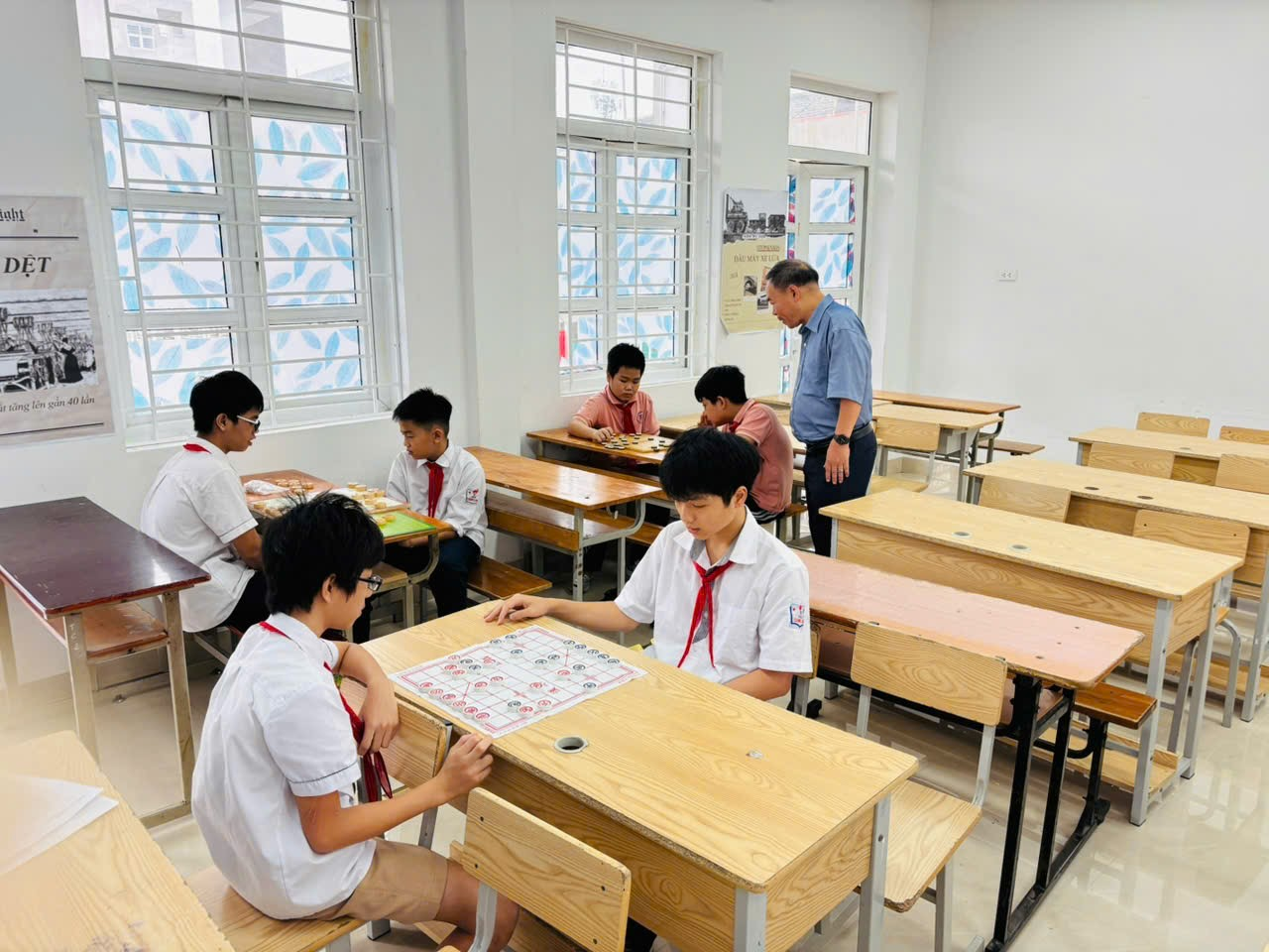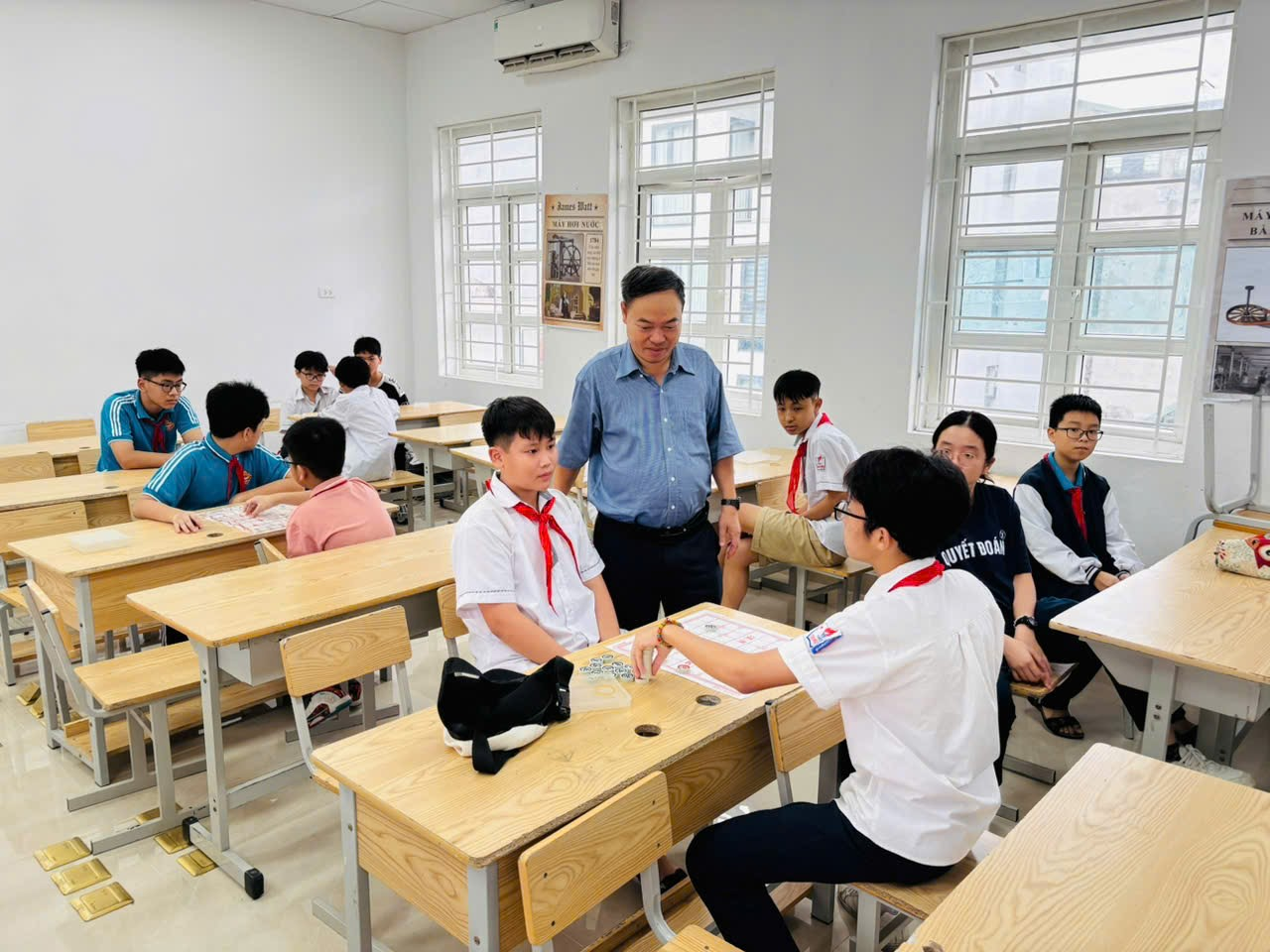 (Thầy Hoàng Mạnh Hà phó hiệu trưởng nhà trường đang theo dõi một trận đấu cờ đầy hấp dẫn)